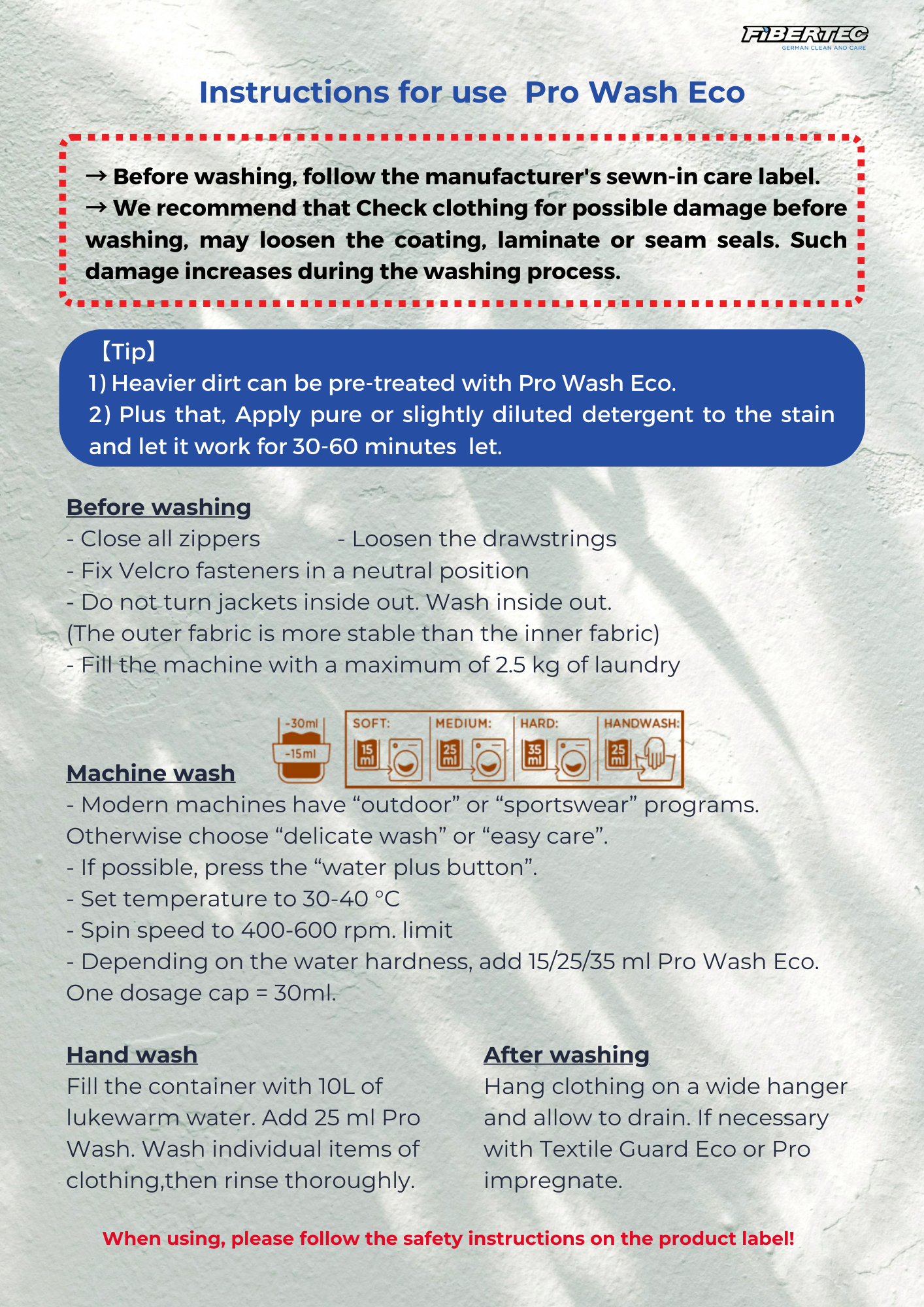 Pro Wash Eco provides excellent washing results even at low temperatures. It washes out residue-free and optimizes the breathability of waterproof-breathable clothing (e.g. GORETEX ®, etc.). In addition, it reduces the pilling of fleece.