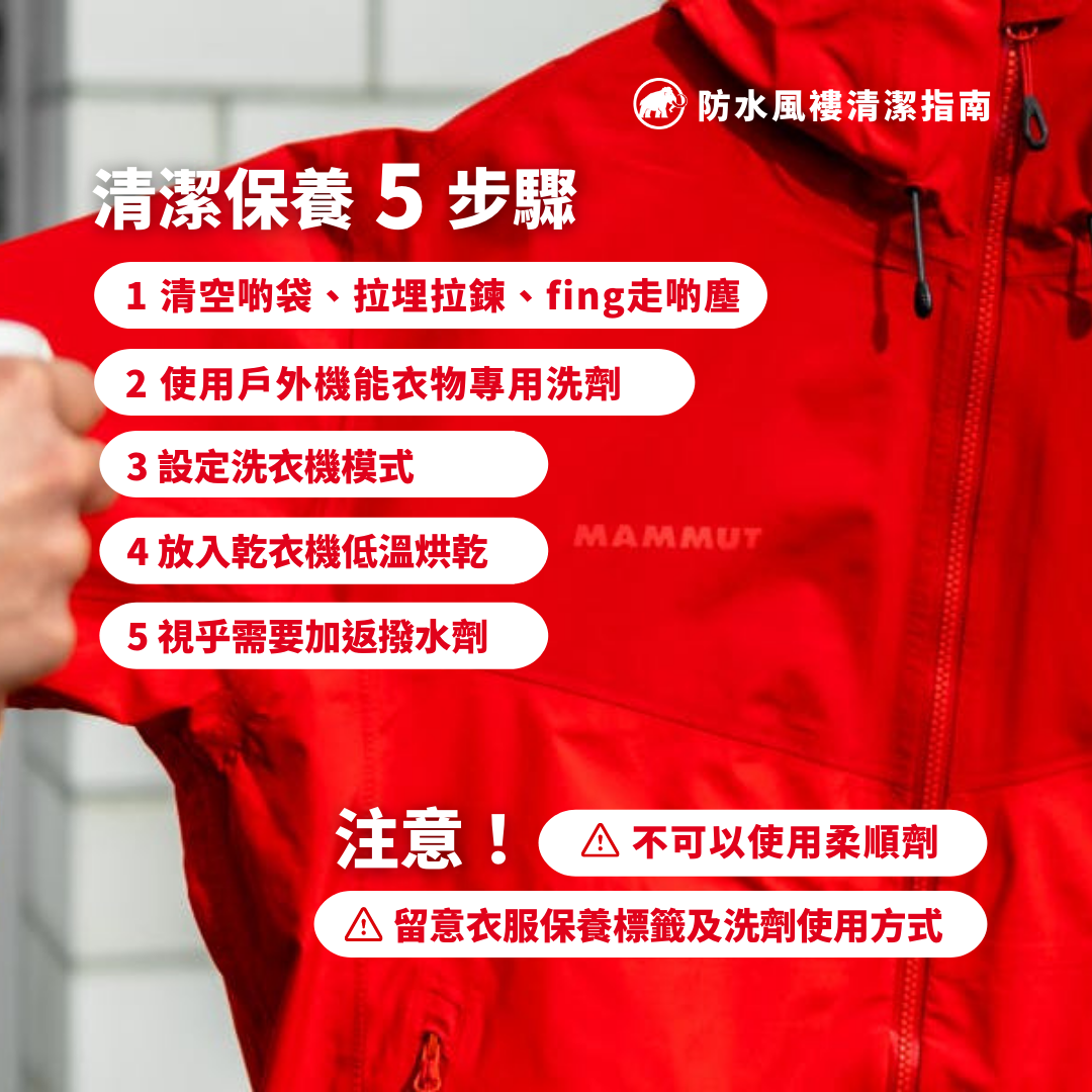 1. 切記清洗防水風褸過程,絕對唔可以用柔順劑,因為柔順劑會封住布料上嘅微小孔洞,將會嚴重影響防水風褸嘅透氣功能。