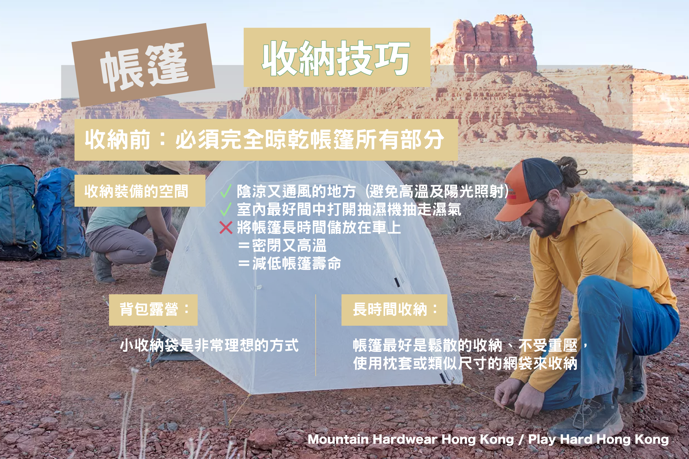 所以收納前必須完全晾乾帳篷所有部分,記得仔細檢查你收納裝備的空間,應該要是陰涼又通風的地方,避免高溫及陽光照射,如果在室內,最好間中打開抽濕機抽走濕氣。