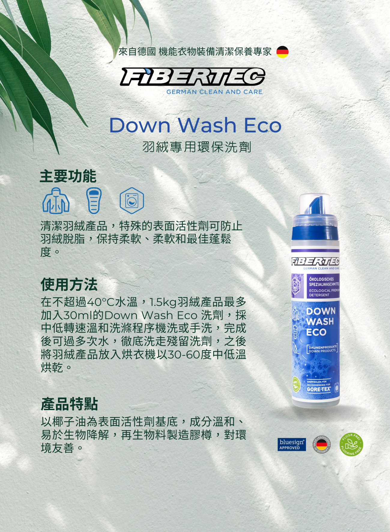 Down Wash Eco 是羽絨的專用清潔濃縮洗劑,由可再生資源製成,可溫和清潔羽絨類的服飾產品。