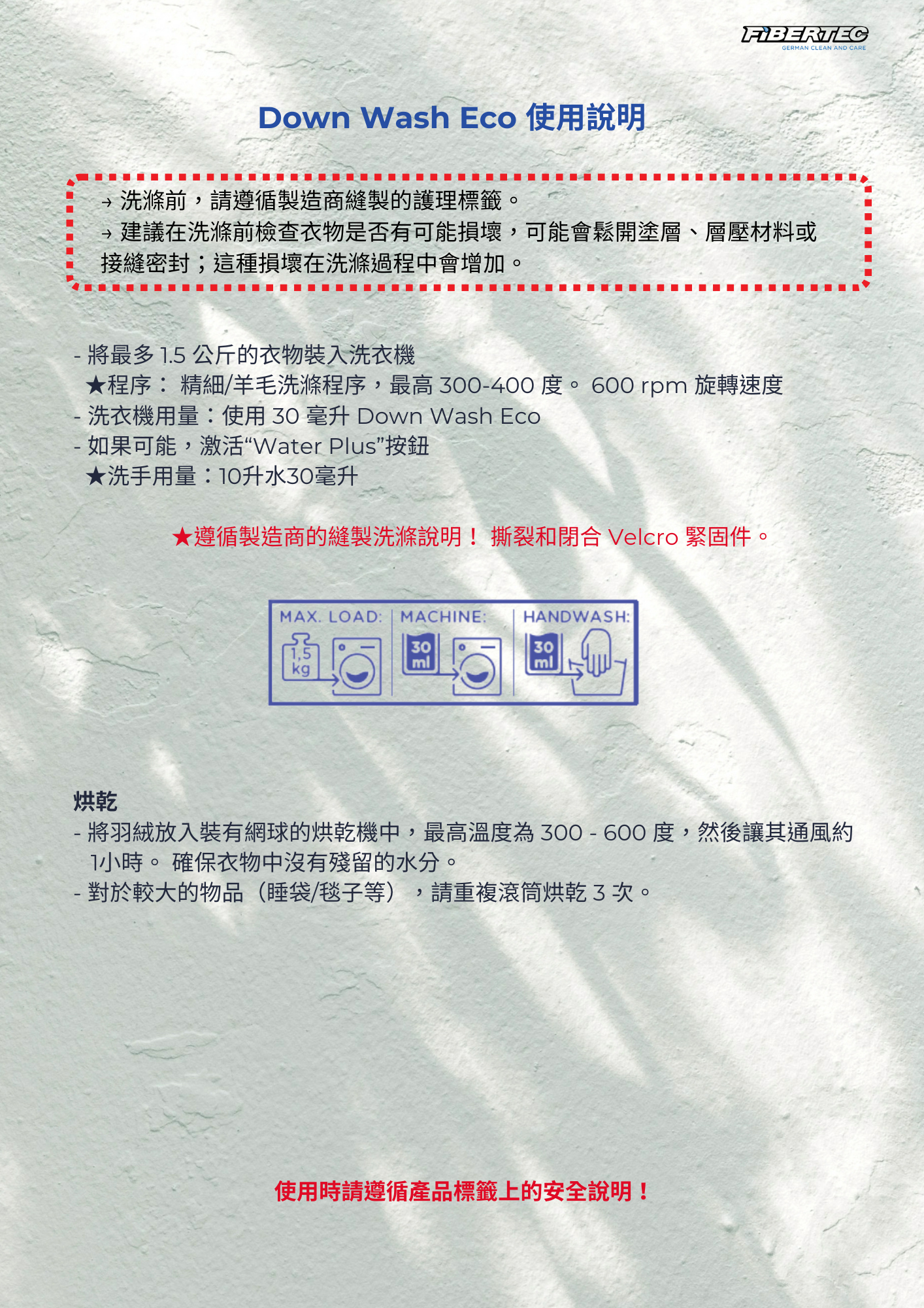 25 毫升羽絨洗滌劑足以洗 2.5 公斤衣物。推薦的洗衣機設置:40 度,最大每分鐘 600 轉 可以激活附加漂洗功能。洗睡袋的時候,睡袋一定還可以在滾筒裡翻!注意:遵循製造商的說明。