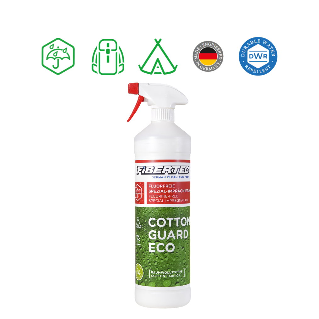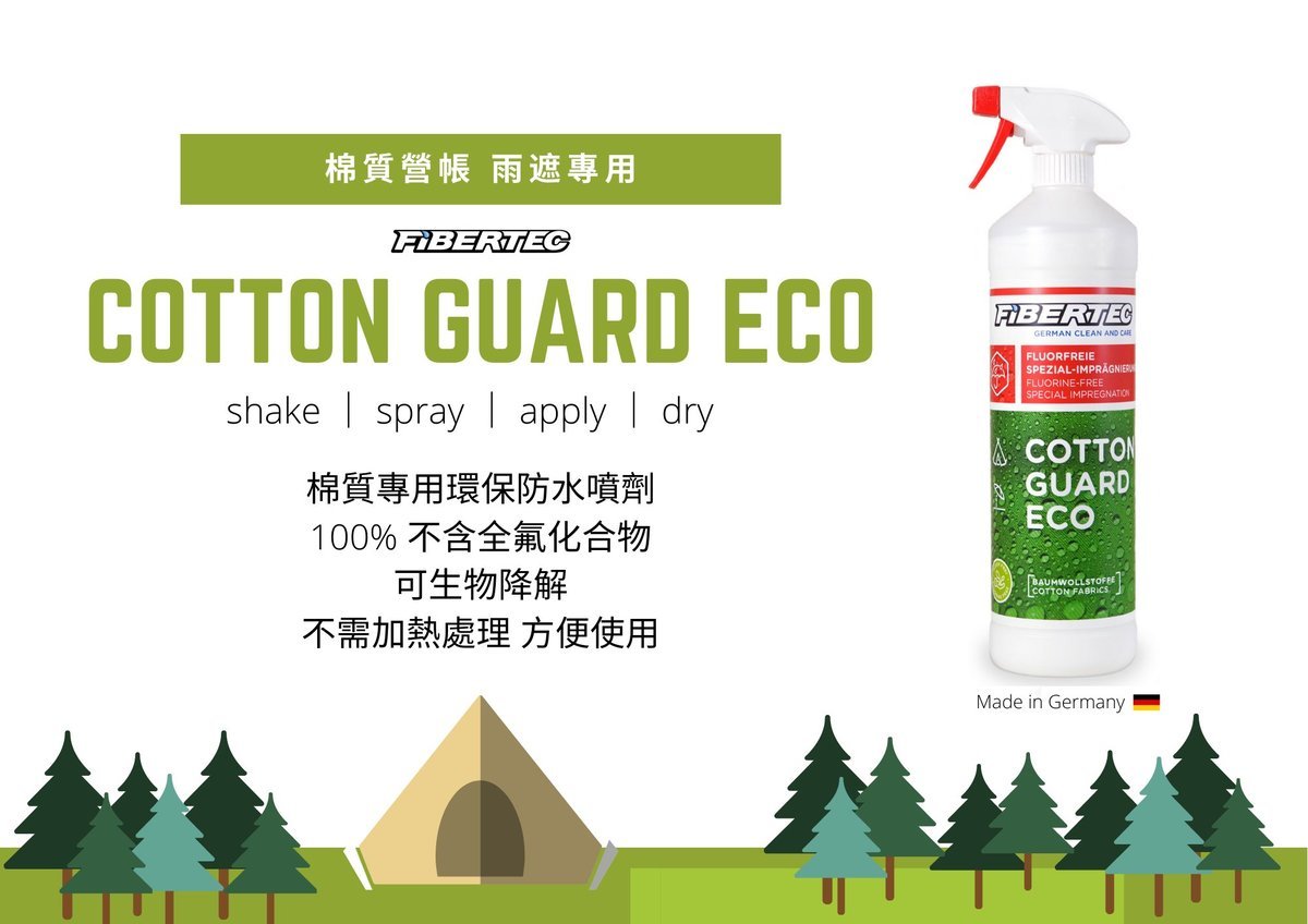 德國品牌Fibertec,專為棉質(或棉佔50%以上的合成面料)營帳、雨遮或包袋類產品打造的環保防水噴劑Cotton Guard Eco