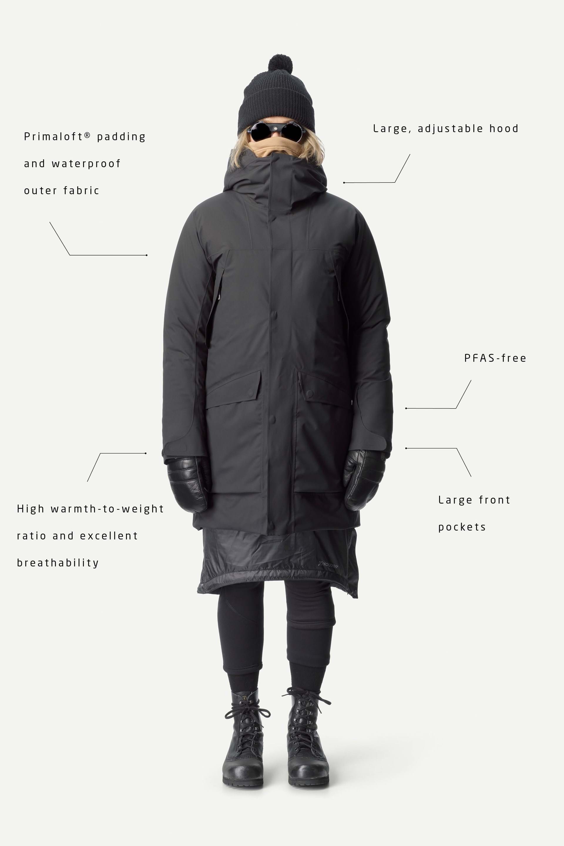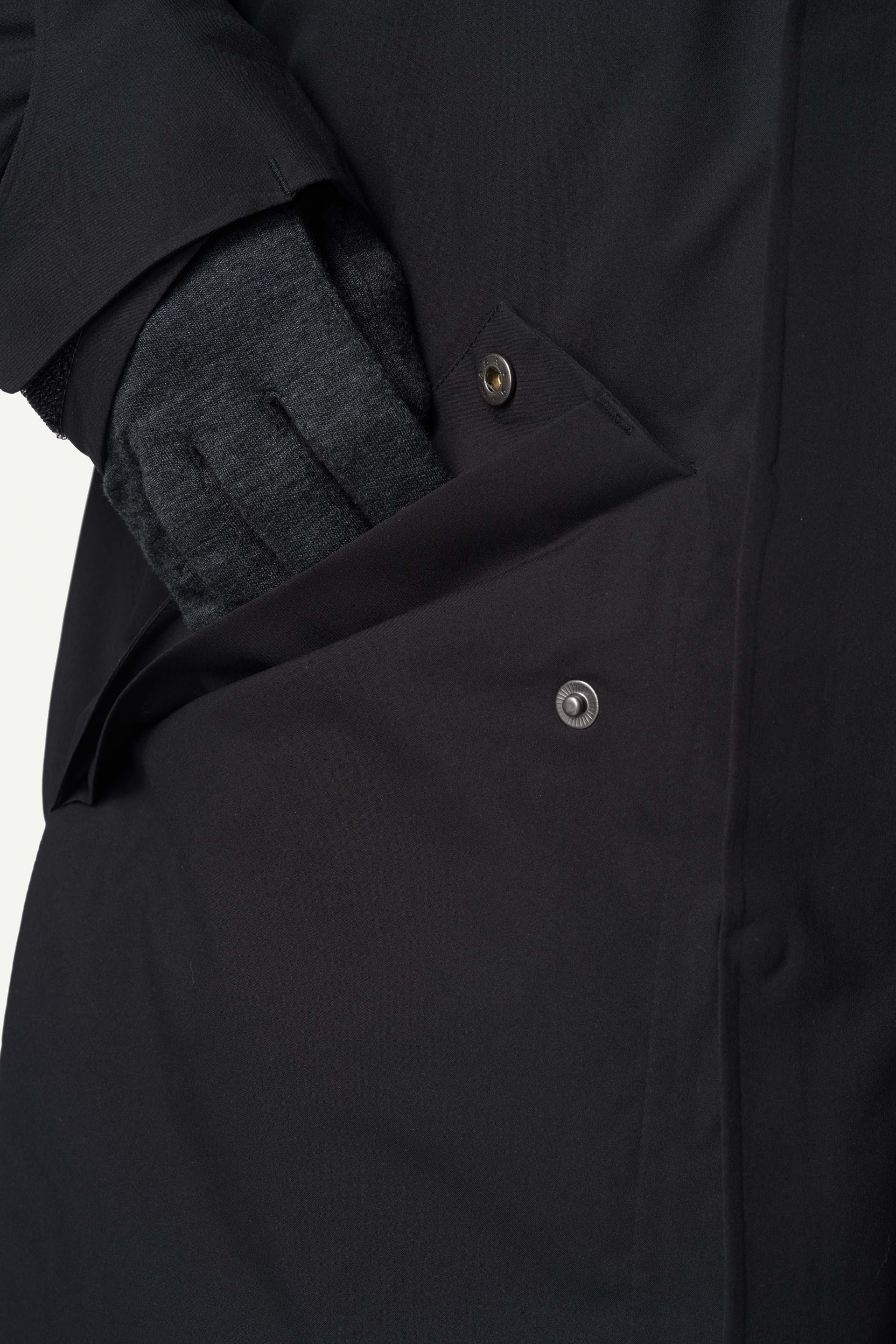這款派克大衣的外層布料名為 Spheric 2-layer Hardshell。這是一種回收且可回收的聚酯纖維布料,並配備我們經過充分測試的 Atmos 薄膜。Atmos 是純聚酯纖維親水性薄膜,無論在薄膜本身或防潑水處理(DWR)上,皆完全不含 PFAS。