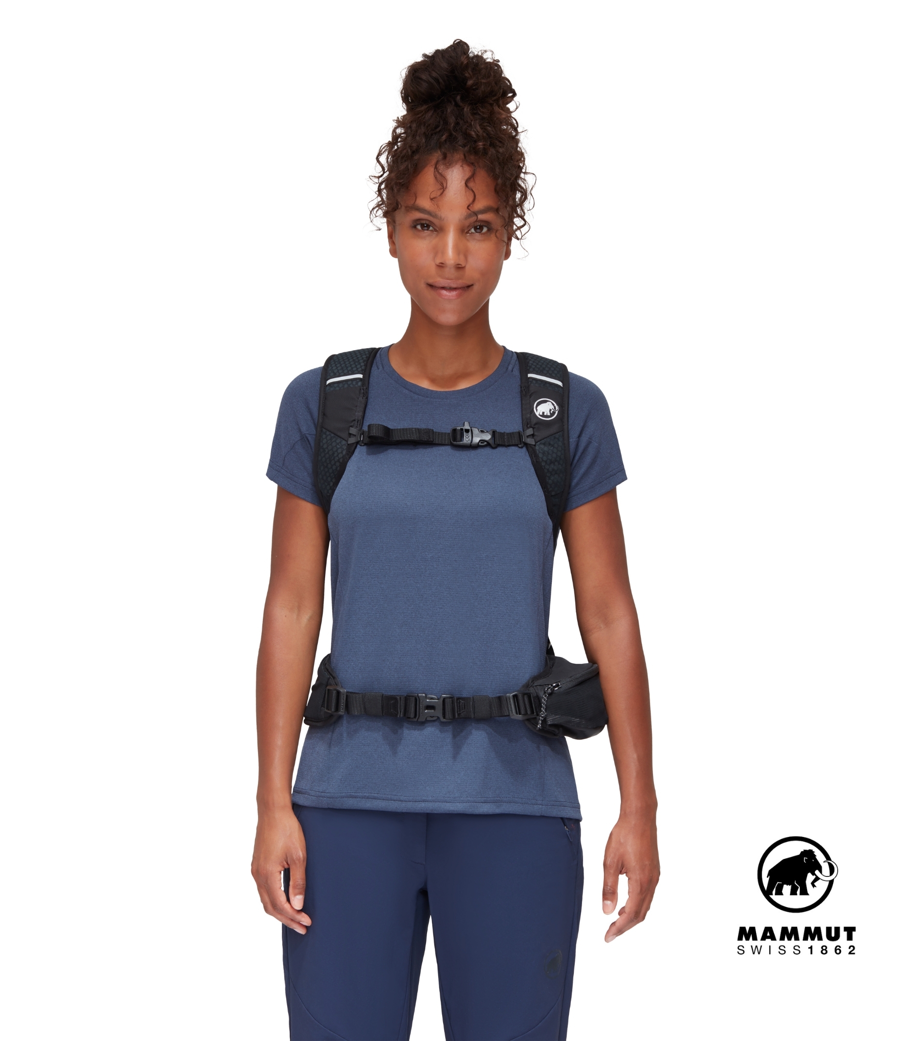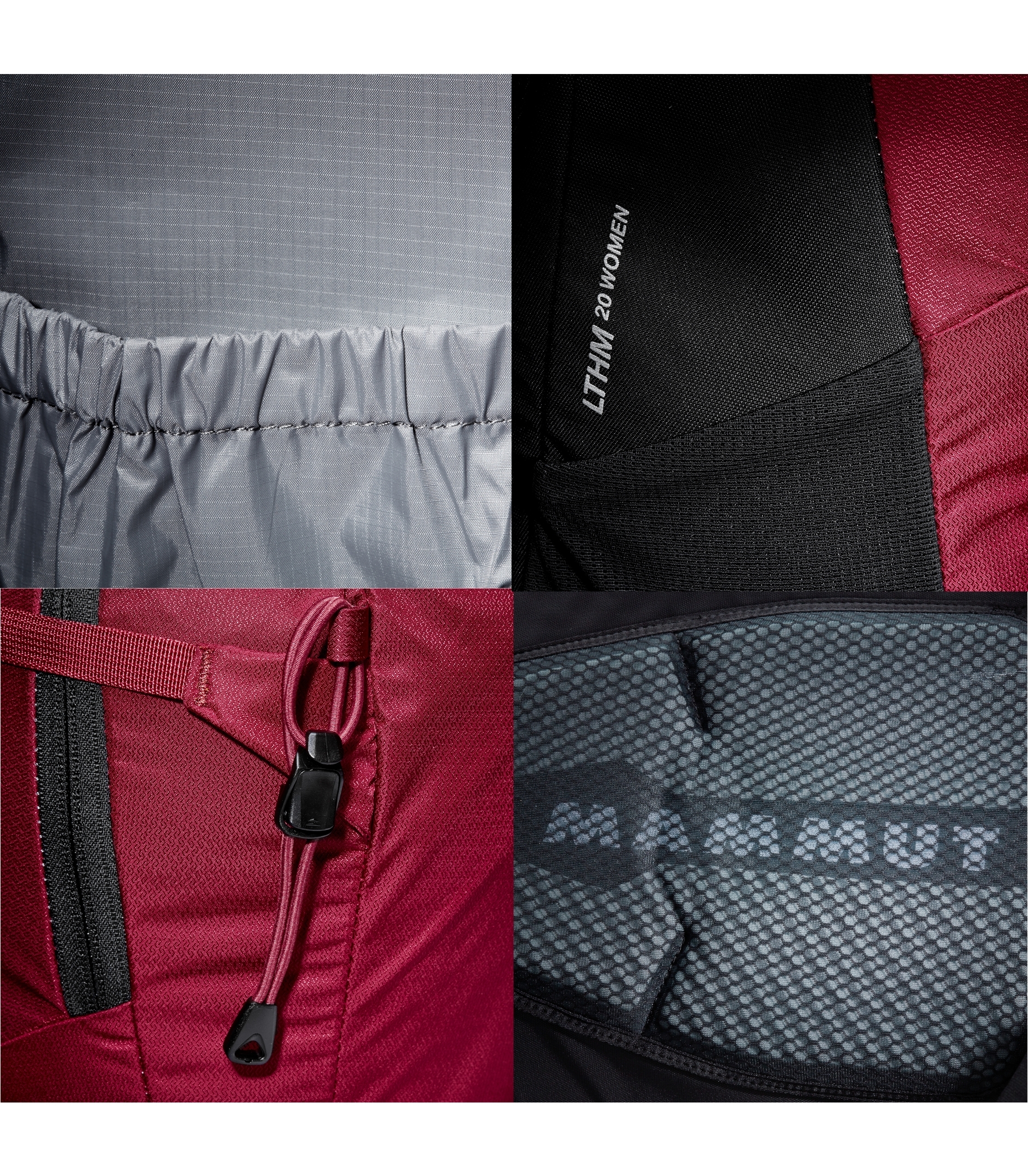 Lithium 20 Women 主要由可回收材料製成,並且持久的防水處理不含 PFC。攜帶系統和肩帶專為女性生理結構設計。非常輕便且透氣的肩部襯墊可提升舒適感。3D EVA 泡棉中的空氣通道可提供良好的通風。帶襯墊的臀帶有一個用於存放智慧手機的可折疊口袋。