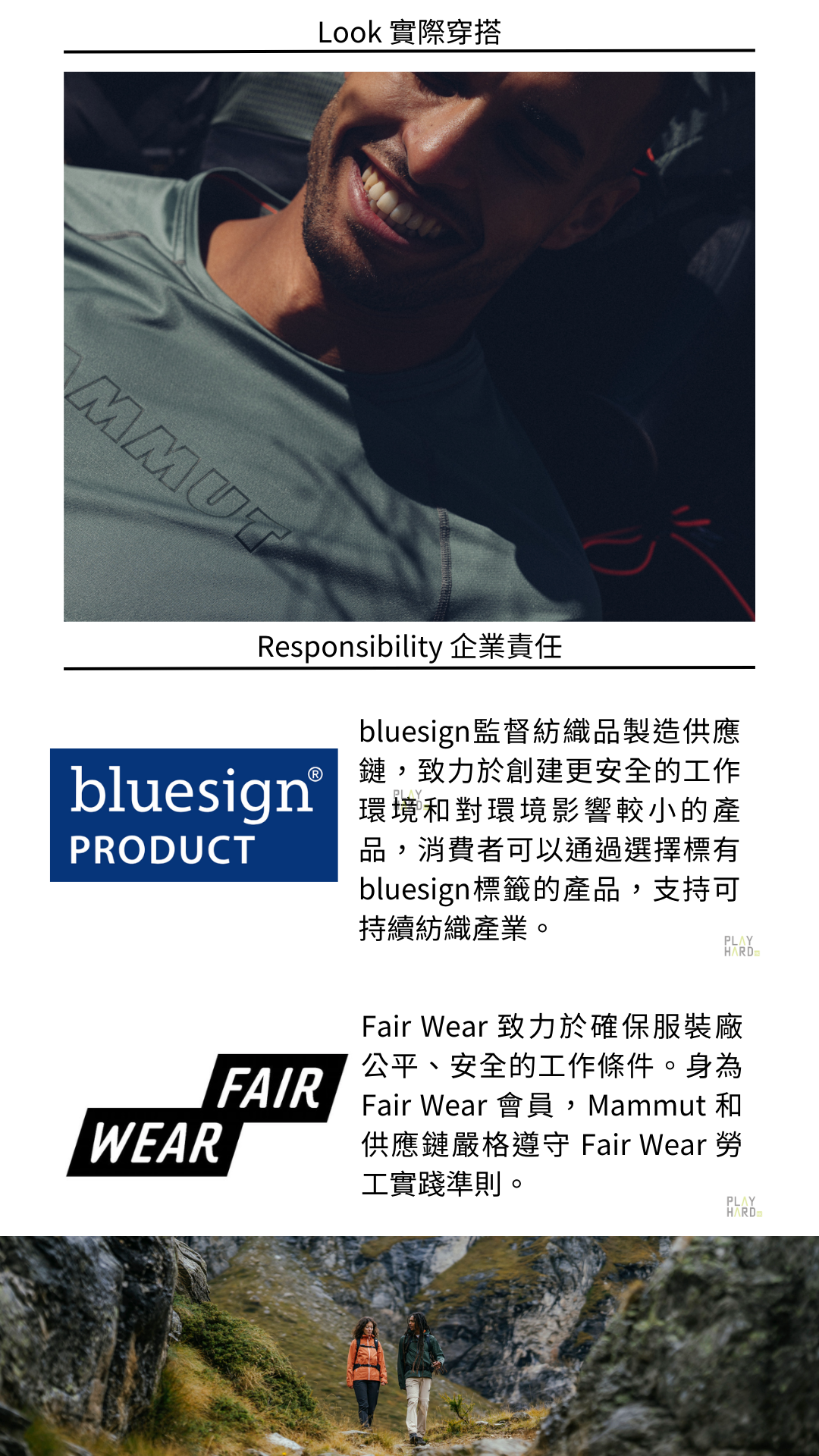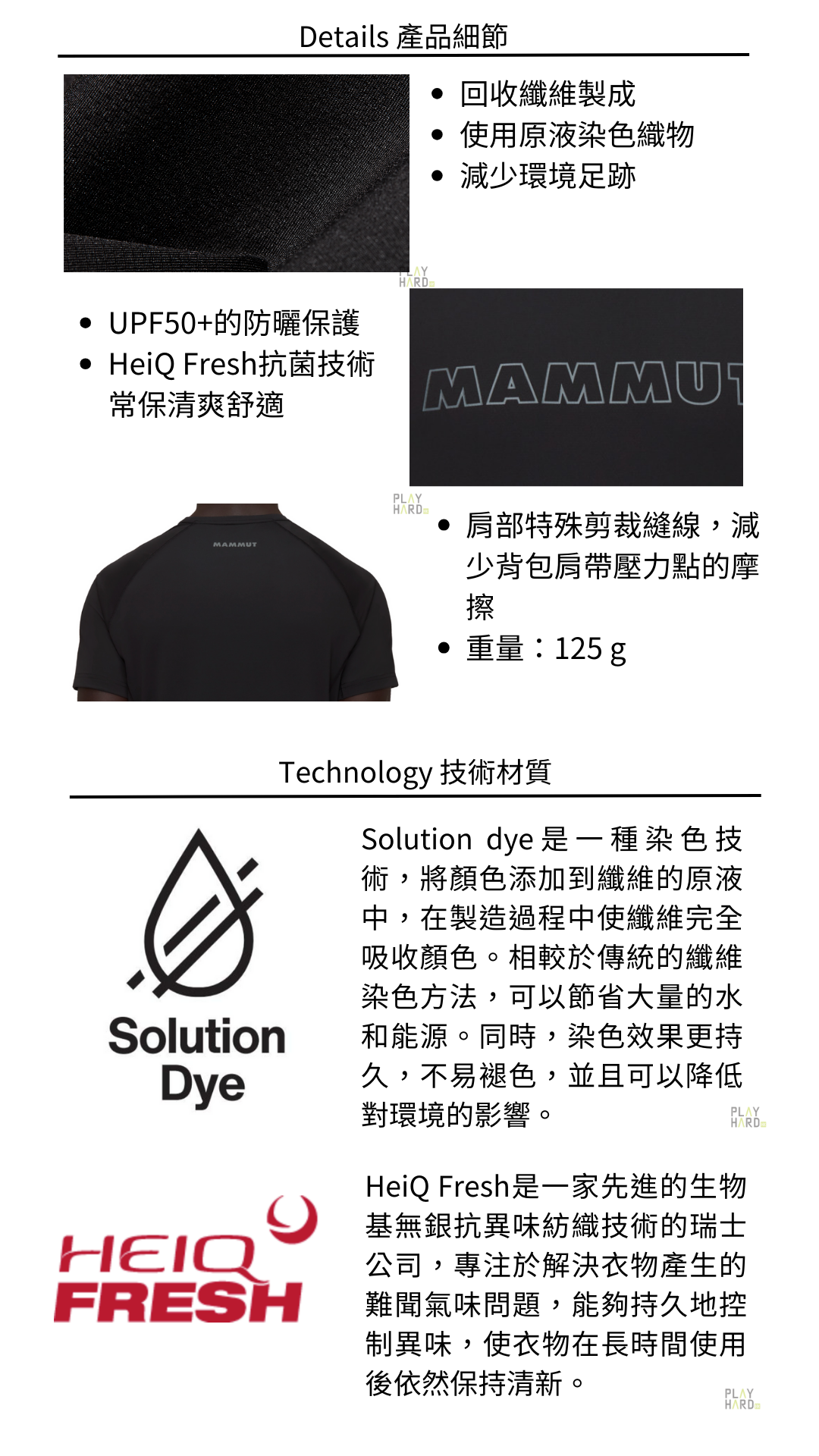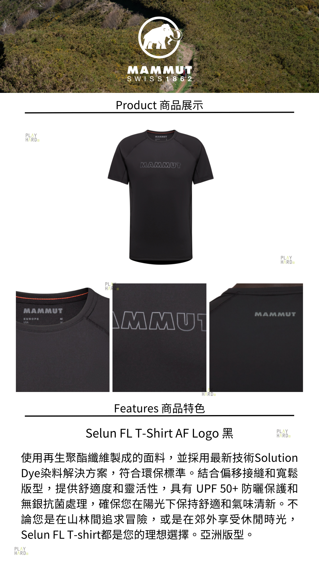 Mammut 男款 防曬快乾衫亞洲版使用再生聚酯纖維製成的面料,並採用最新技術Solution Dye染料解決方案,符合環保標準。