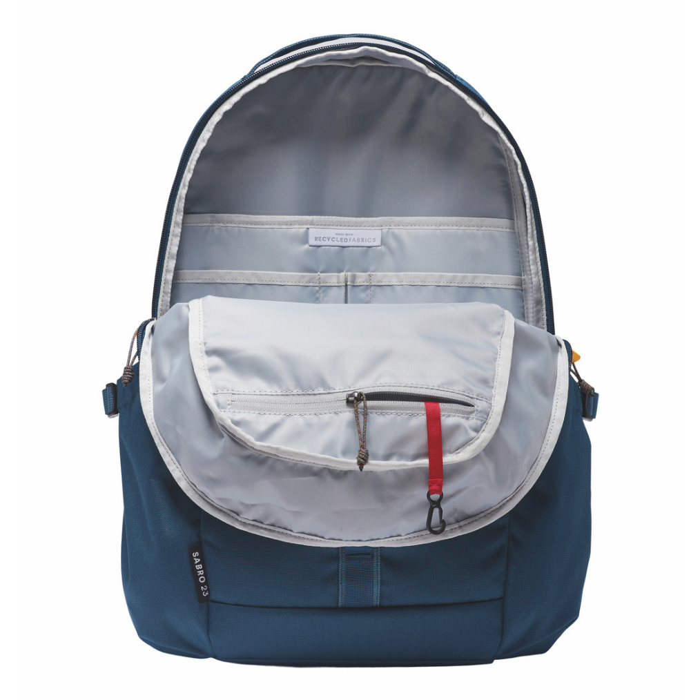 Sabro 背包採用耐用、防水且 100% 可回收的外殼布料,流線型、簡約,但具有全天課程和徒步往返所需的所有組織性和舒適性。 該包的主隔層配有 15 吋帶襯墊的筆記型電腦套,以及內部拉鍊和落袋,可存放小物品。