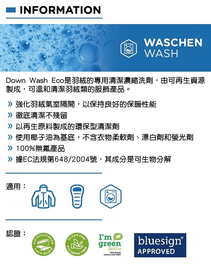 Fibertec Down Wash Eco 是羽絨服飾專業護理清潔劑強化羽絨氣室隔間:有效維持羽絨蓬鬆度,確保優異的保暖性能。