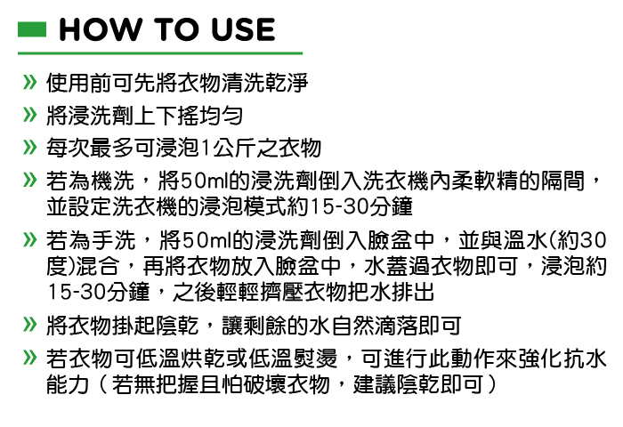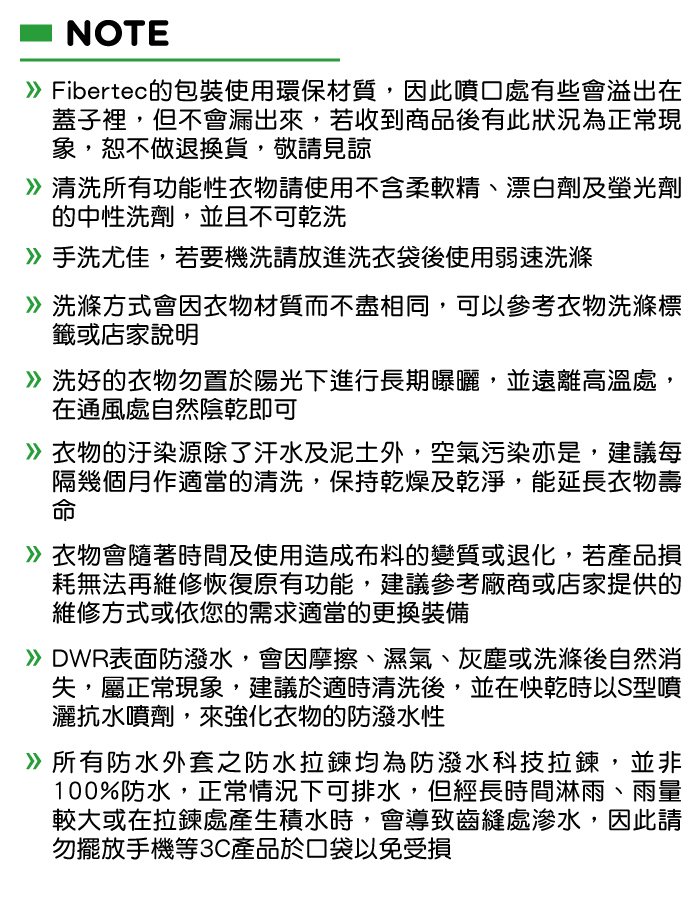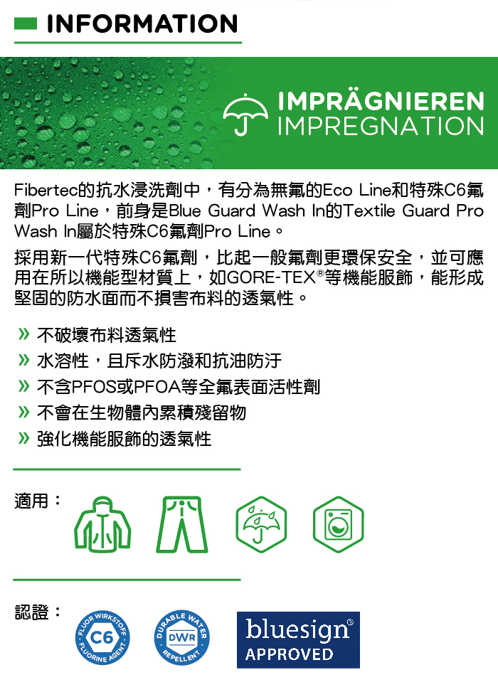 Fibertec的抗水浸洗劑中,有分為無氟的Eco Line和特殊C6氟劑Pro Line,前身是Green Guard Wash 的textile Guard Eco Wash in 屬於無氟的Eco Line。